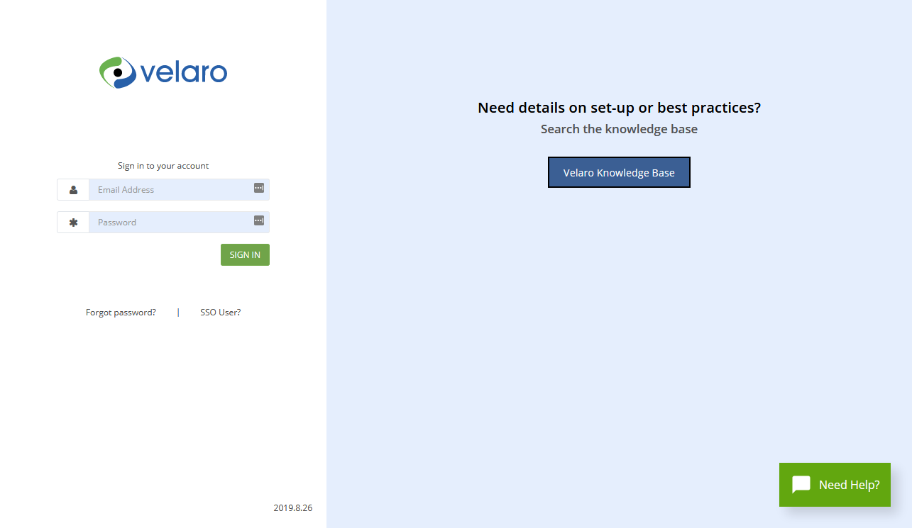 | Sign In | The log in screen will allow a Velaro user to log in or reset a forgotten password | |