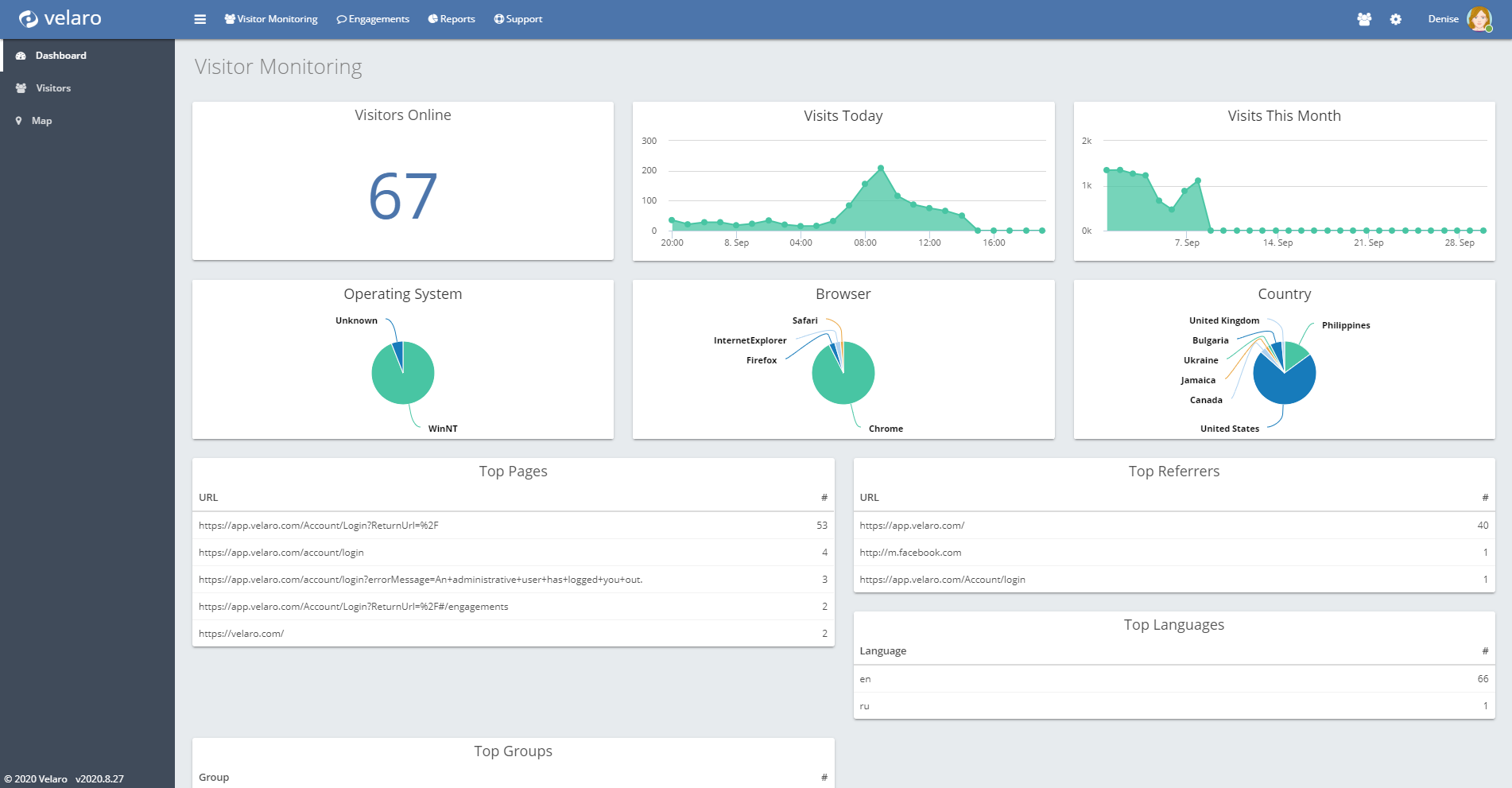| Visitor Monitoring Dashboard | Visitor Monitoring displays a set of widgets that provide visitor data and manual proactive chat options. | |