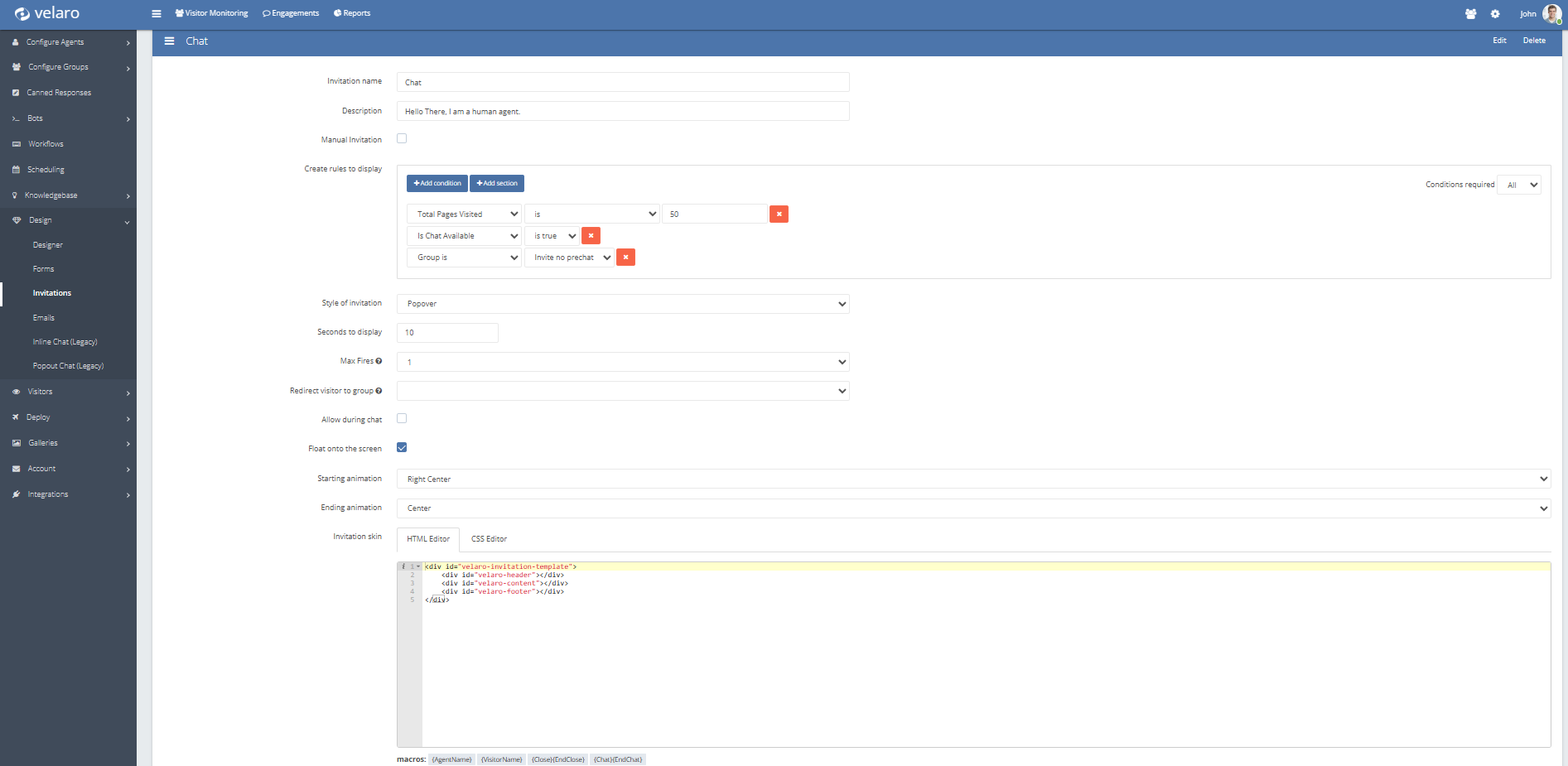 | HTML Editor | Allows you to modify the HTML for Pop-over invitations, including layout and the position of the close (X) button. Recommended starting template: html<br><div id="velaro-invitation-name"><br> <div id="velaro-content"><br> </div><br><br> {Chat}<br> <img src="REPLACE WITH IMAGE URL" />{EndChat} {Close}<br><br> <p style="position: absolute; top:0px; left:250px;"><br> <img src="REPLACE WITH URL FOR X OR CLOSE" />{EndClose}<br> </p><br></div><br> |