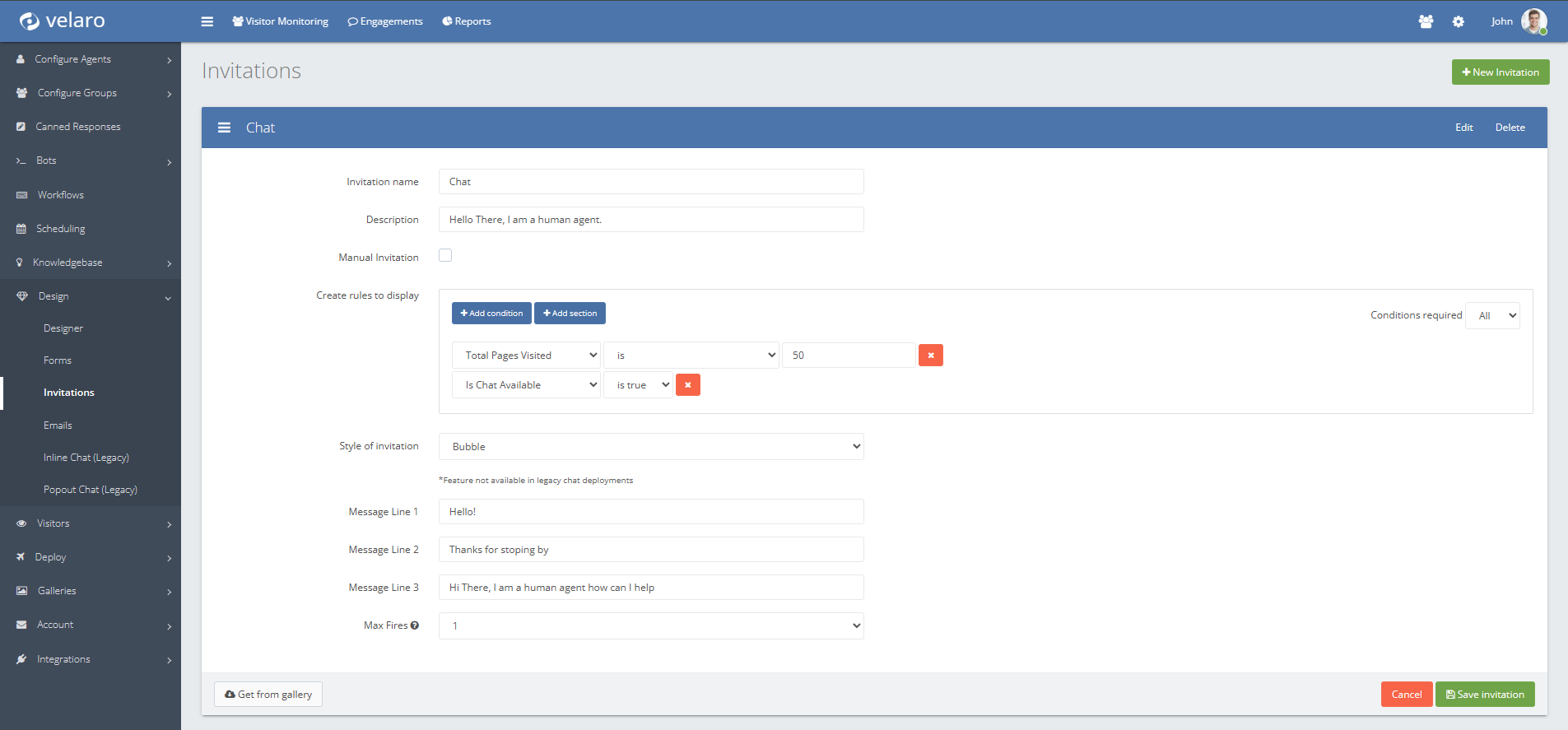 Invitations let you present proactive chat prompts in different formats such as Inline, Bubble, and Pop-Over to help you guide visitors into a conversation at the right moment. You control the content, appearance, and behavior of each invitation through the settings in the invitation editor.