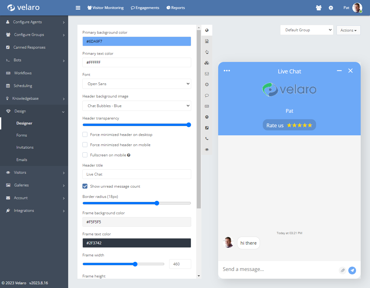 You can access these settings here: https://app.velaro.com/#/admin/design/designer