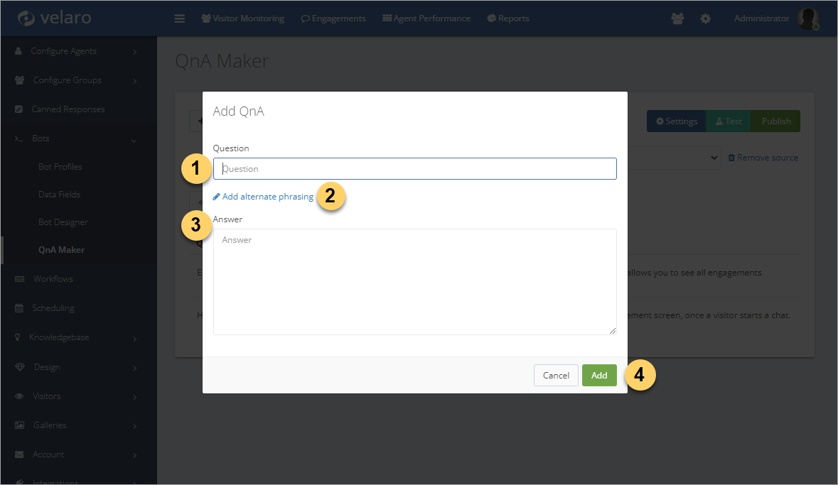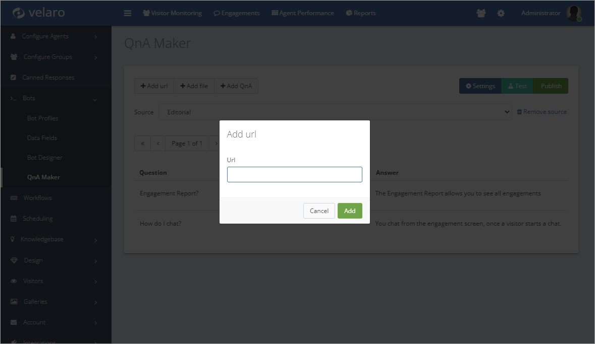 The Velaro QnA Maker enables the upload and creation of questions and their answers, to easily enable a chatbot with natural language understanding capability to listen to your visitor's questions, and supply the correct answers.