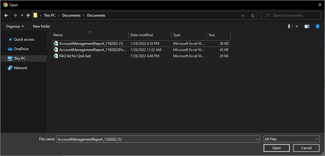 select โ+Add fileโ to upload a file in Excel, Word, or CSV format.