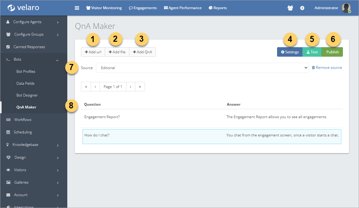 | 7 | Source | Manage different sources through this drop down, each set of QnAs is housed in the source they were imported from. |