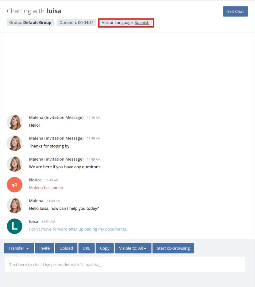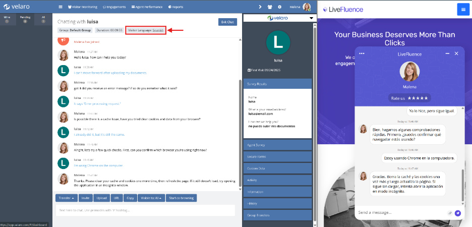 - To resume proper translation, the agent must update the visitor language to Spanish. Once changed, the agent’s messages will translate into Spanish, and the visitor’s replies will appear in English again.